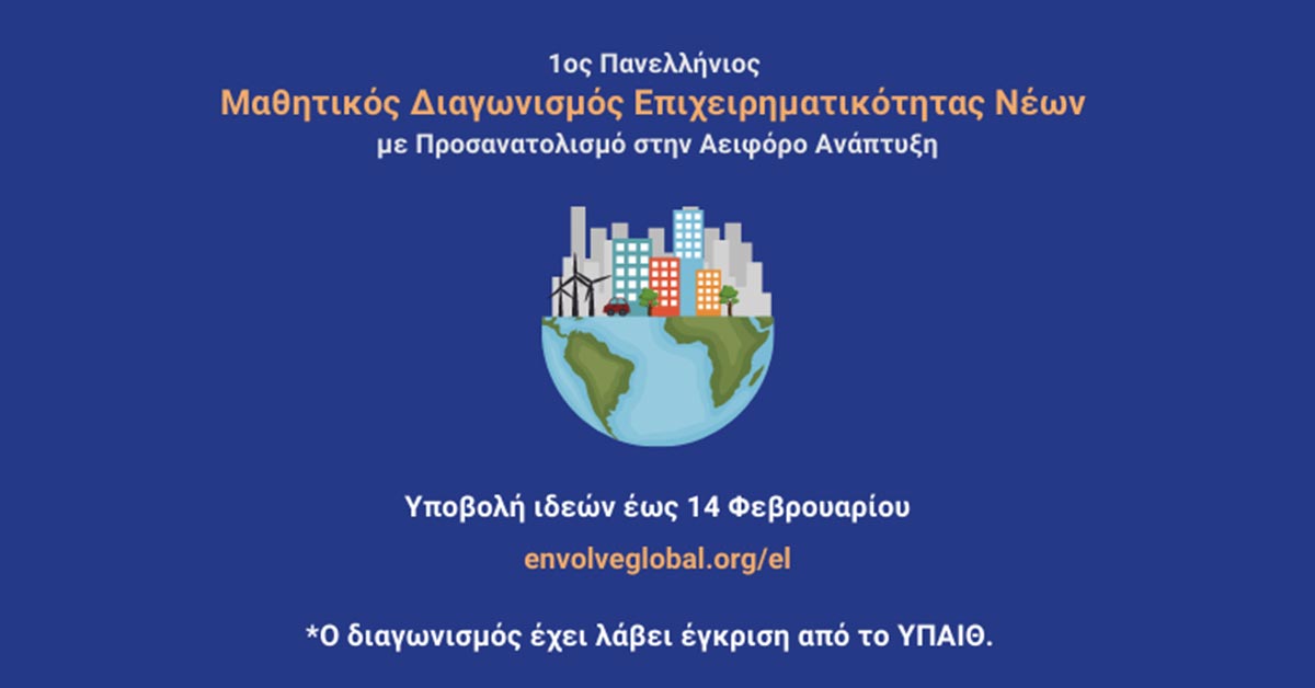 Ένας μήνας έμεινε για την υποβολή αιτήσεων στον «1ο Πανελλήνιο Μαθητικό Διαγωνισμό Επιχειρηματικότητας Νέων με προσανατολισμό στην Αειφόρο Ανάπτυξη». Το Envolve Entrepreneurship προσκαλεί ομάδες από σχολεία όλης της Ελλάδας να υποβάλουν τις αιτήσεις τους έως τις 14 Φεβρουαρίου 2021. O διαγωνισμός είναι εγκεκριμένος από το Υπουργείο Παιδείας και Θρησκευμάτων.