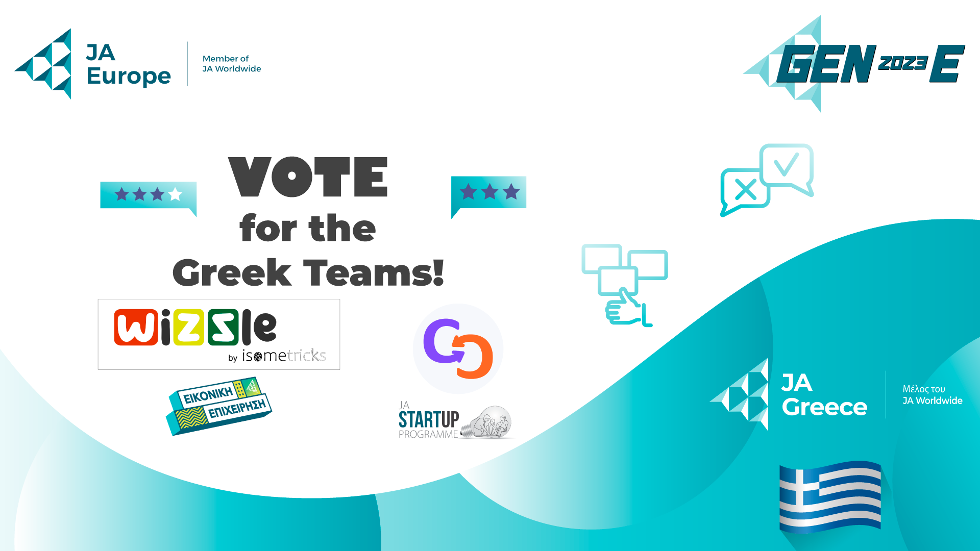 Μπορούμε να στηρίξουμε ενεργά τις δύο ελληνικές ομάδες συμμετέχοντας στην ψηφοφορία για το βραβείο του κοινού, το Public Choice Award, στην επίσημη ιστοσελίδα του GEN-E 2023: gen-e.eu/ . Για να ψηφίσετε τη μαθητική ομάδα «Isometricks» επιλέγετε το JA Company Program και για να ψηφίσετε τη φοιτητική ομάδα «Carexhange» επιλέγετε το JA Start Up. Θα δείτε στη συνέχεια τη λίστα με τις χώρες, θα διαλέξετε «Greece», θα βρείτε την ομάδα και στη συνέχεια θα ψηφίσετε. Η ψηφοφορία διεξάγεται στον διαδικτυακό εκθεσιακό χώρο (virtual expo area) του GEN-E στον οποίο παρουσιάζουν τις ιδέες τους όλες οι ομάδες. Στην ίδια πλατφόρμα gen-e.eu/ μπορείτε να ενημερωθείτε για όλες τις εξελίξεις και να παρακολουθήσετε live την φαντασμαγορική τελετή των βραβεύσεων στις 13 Ιουλίου 2023.