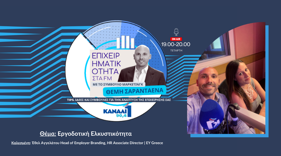 Στη εκπομπή «Επιχειρηματικότητα στα FM» από το Κανάλι 1 – 90,4 FM της Τετάρτης 28/6/2023 παρουσιάστηκε η έννοια της εργοδοτικής ελκυστικότητας (Employer Branding) και απαντήθηκαν τα βασικά ερωτήματα γύρω από την δυσκολία ανεύρεσης προσωπικού σήμερα.