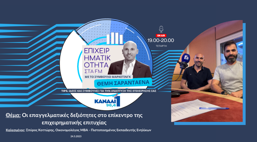 Στη εκπομπή «Επιχειρηματικότητα στα FM» από το Κανάλι 1 – 90,4 FM της Τετάρτης 24/5/2023 παρουσιάστηκε πως οι επαγγελματικές δεξιότητες (Soft Skills) μπορούν να ενισχύσουν και να βοηθήσουν ένα επιχειρηματία να οδηγηθεί στην επιτυχία.