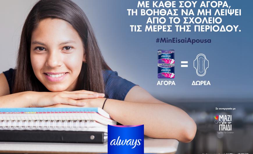 Η Always ξεκινά την εκστρατεία #MinEisaiApousa για να εξασφαλίσει ότι η έλλειψη προστασίας κατά τη περίοδο δεν θα εμποδίσει την μάθηση και την αυτοπεποίθηση των κοριτσιών. Η Always και η Ένωση «Μαζί για το Παιδί» ενώνουν τις δυνάμεις τους για να εξασφαλίσουν πως κανένα κορίτσι δεν θα χάσει το σχολείο λόγω της έλλειψης γυναικείων προϊόντων υγιεινής που επιφέρει η οικονομική δυσχέρεια. Το όραμά τους είναι να δωρίσουν πάνω από 800.000 προϊόντα σε κορίτσια που το έχουν ανάγκη.