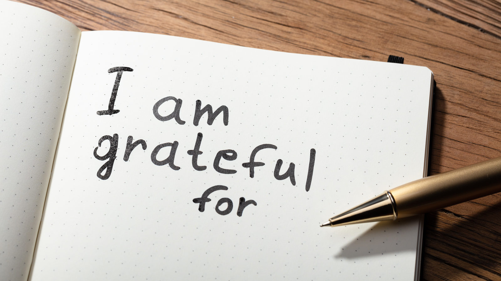 Close-up Of Gratitude Word With Pen On Notebook Over Wooden Desk