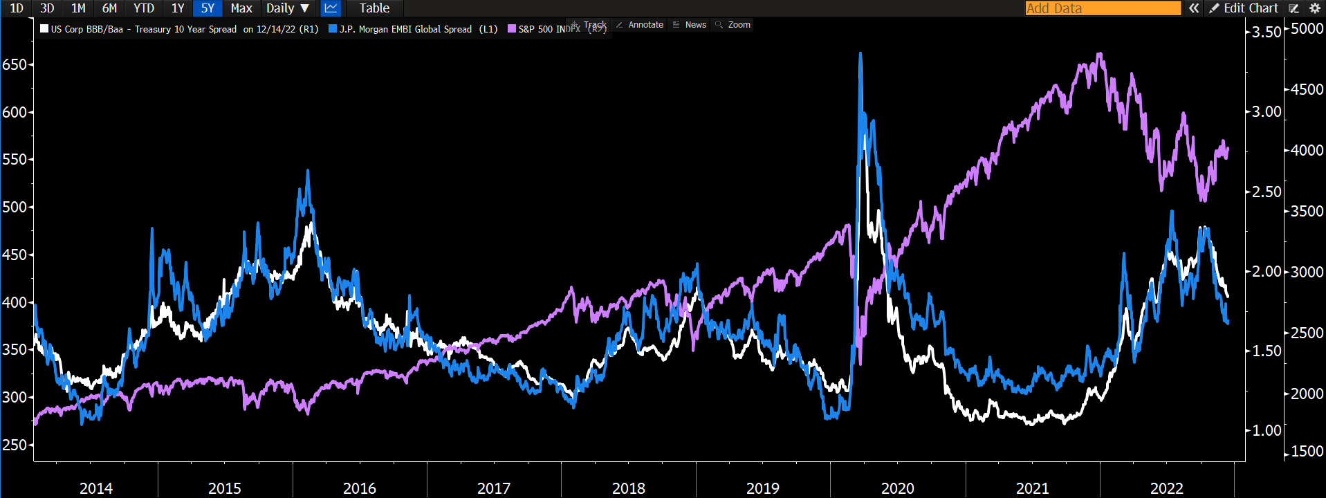 Τα credit spreads, σε Αμερική και αναδυόμενες αγορές έχουν κορυφώσει και κινούνται χαμηλότερα σε μια κίνηση η οποία δεν έχει αποτυπωθεί από τον S&P 500. Αυτό είναι μια ένδειξη η οποία βραχυπρόθεσμα δείχνει ότι ο αμερικανικός δείκτης έχει περιθώρια ανόδου καθώς εμφανίζεται υποτιμημένος. Με απλά λόγια, οι ενδείξεις από την αγορά ομολόγων μαρτυρούν ότι υπάρχει αποκλιμάκωση του φόβου στις αγορές.