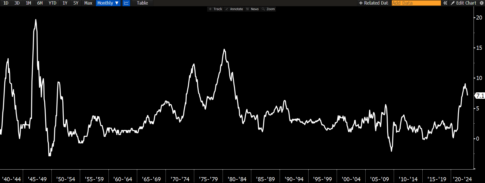 Σύμφωνα με το παρελθόν, σε όλες τις περιόδους όπου υπήρξε έντονη άνοδος του πληθωρισμού, ακολούθησε και έντονη πτώση. Αυτό είναι και το σενάριο που φαίνεται να παρακολουθούμε και σε αυτή τη φάση. Άλλωστε, είναι ο τρίτος συνεχόμενος μήνας που παρατηρείται επιβράδυνση του πληθωρισμού. Στο παρακάτω ιστορικό γράφημα, αποτυπώνεται το πως κινείται ο πληθωρισμός μετά από περιόδους έντονων διακυμάνσεων.