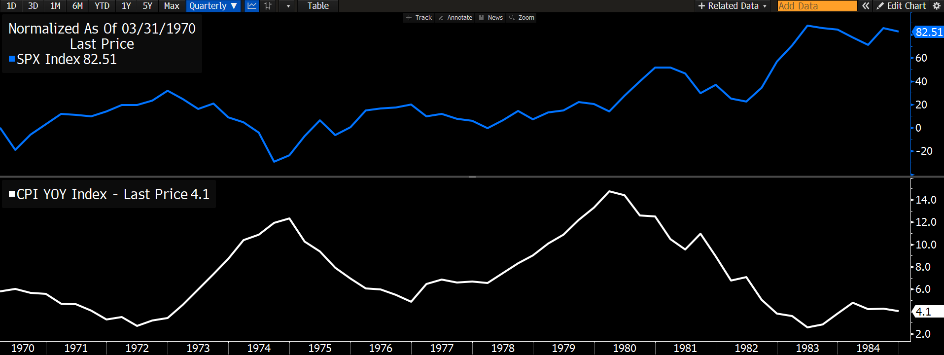 Το τελευταίο χρονικό διάστημα, αρκετές αναφορές γίνονται και στην περίοδο 1970-1980 και στο γεγονός ότι ο πληθωρισμός είχε τρία διαφορετικά κύματα πριν κορυφώσει και ότι κάτι παρόμοιο θα μπορούσε να συμβεί και την τρέχουσα περίοδο. Αν και οι δυο περίοδοι είναι διαφορετικές μεταξύ τους, θα μπορούσαμε να υποθέσουμε ότι κάτι ανάλογο θα συμβεί και τώρα. Πως κινήθηκε η αγορά μετοχών τότε και πως έχει κινηθεί σήμερα;