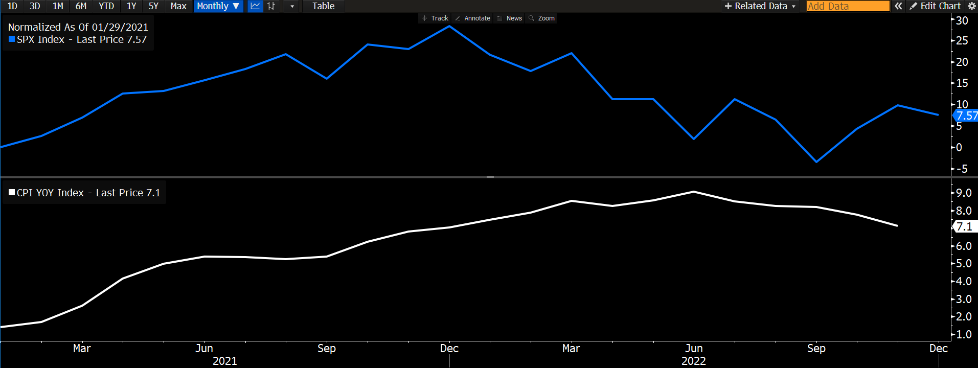 Η ανακοίνωση του πληθωρισμού για το Νοέμβριο σκόρπισε ενθουσιασμό στις αγορές καθώς σημείωσε περαιτέρω αποκλιμάκωση στο 7,1% με όλους τους δείκτες πληθωρισμού να σημειώνουν ταχύτατη αποκλιμάκωση. Επιπρόσθετα, σύμφωνα με αναλύσεις, αν αφαιρέσουμε την επίδραση των ενοικίων η οποία αργεί να αποτυπωθεί στον πληθωρισμό, τότε ο πραγματικός πληθωρισμός είναι σημαντικά χαμηλότερος.