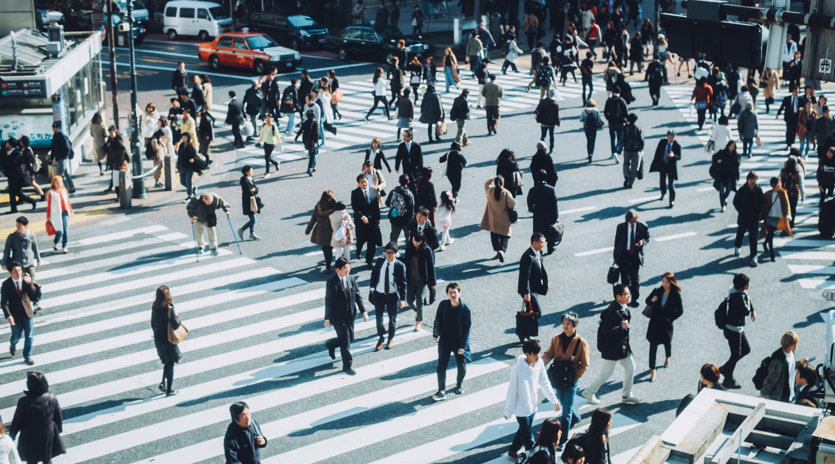 Busy commuters crossing street during office rush hours in Shibuya crossroad, Tokyo