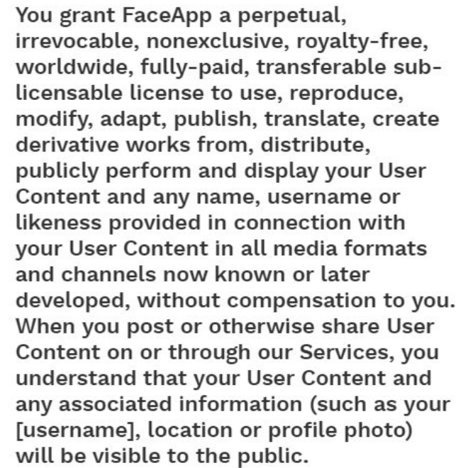 Σύμφωνα με τους όρους του FaceApp οι άνθρωποι εξακολουθούν να κατέχουν το δικό τους «περιεχόμενο χρήστη» (δηλαδή τις φωτογραφίες με το πρόσωπό τους), η εταιρεία κατέχει μια άνευ χρονικού ορίου και αμετάκλητη άδεια χωρίς δικαιώματα, για να κάνει ό, τι θέλει μαζί με αυτό. Χορηγείτε στο FaceApp μια αέναη, αμετάκλητη, μη αποκλειστική, απεριόριστη, παγκόσμια, άνευ οικονομικών απαιτήσεων άδεια χρήσης για αναπαραγωγή, τροποποίηση, προσαρμογή, δημοσίευση, μετάφραση, δημιουργία παράγωγων έργων, αναφέρουν μεταξύ άλλων οι όροι.