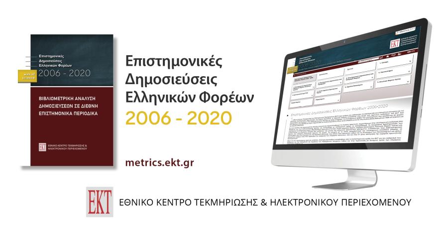 Η ηλεκτρονική έκδοση του ΕΚΤ “Επιστημονικές Δημοσιεύσεις Ελληνικών Φορέων 2006-2020: Βιβλιομετρική ανάλυση δημοσιεύσεων σε διεθνή επιστημονικά περιοδικά – Web of Science” διατίθεται στη διεύθυνση report09.metrics.ekt.gr με διαδραστική πλοήγηση σε έναν εκτενή αριθμό στοιχείων, δεικτών και γραφημάτων. Τα στοιχεία δημοσιεύσεων και αναφορών που χρησιμοποιήθηκαν για τον υπολογισμό των δεικτών αντλήθηκαν από τη διεθνή βάση δεδομένων Web of Science και καλύπτουν την περίοδο 2006-2020.