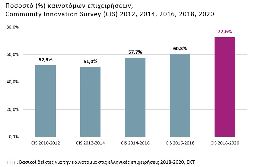 Όπως προκύπτει από τα αποτελέσματα της έρευνας, στην Ελλάδα την περίοδο 2018-2020, το 72,6% των επιχειρήσεων καινοτομούν, εισάγοντας νέα ή βελτιωμένα προϊόντα και εφαρμόζοντας νέες επιχειρησιακές διαδικασίες. Το ποσοστό των καινοτόμων επιχειρήσεων παρουσιάζει ανοδική πορεία τα τελευταία έτη και την περίοδο 2018-2020 είναι αυξημένο κατά 12,3 ποσοστιαίες μονάδες σε σχέση με την αμέσως προηγούμενη περίοδο 2016-2018. Η αύξηση αυτή είναι αξιοσημείωτη και σχετίζεται με τις απαιτήσεις για νέα προϊόντα και επιχειρησιακές διαδικασίες που υιοθέτησαν οι ελληνικές επιχειρήσεις λόγω των οικονομικών και κοινωνικών συνθηκών που επέφερε η πανδημία το 2020 (έτος που ανήκει στην τριετία αναφοράς 2018-2020).