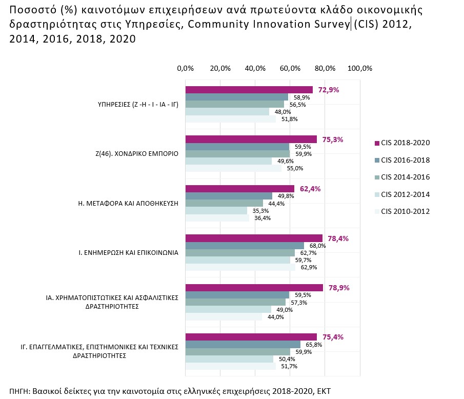 Η βελτίωση των επιδόσεων των ελληνικών επιχειρήσεων ως προς την καινοτομία είναι μεγαλύτερη στον τομέα των Υπηρεσιών. Την περίοδο 2018-2020 το ποσοστό καινοτόμων επιχειρήσεων στον τομέα των Υπηρεσιών ανέρχεται σε 72,9%, σε σχέση με 58,9% την περίοδο 2016-2018, παρουσιάζοντας αύξηση κατά 14 ποσοστιαίες μονάδες. Τα υψηλότερα ποσοστά καινοτόμων επιχειρήσεων καταγράφονται στον κλάδο «Χρηματοπιστωτικές και ασφαλιστικές δραστηριότητες» (78,9%) και στον κλάδο «Ενημέρωση και επικοινωνία» (78,4%), τον κατεξοχήν κλάδο των Τεχνολογιών Πληροφορίας και Επικοινωνιών (ΤΠΕ).