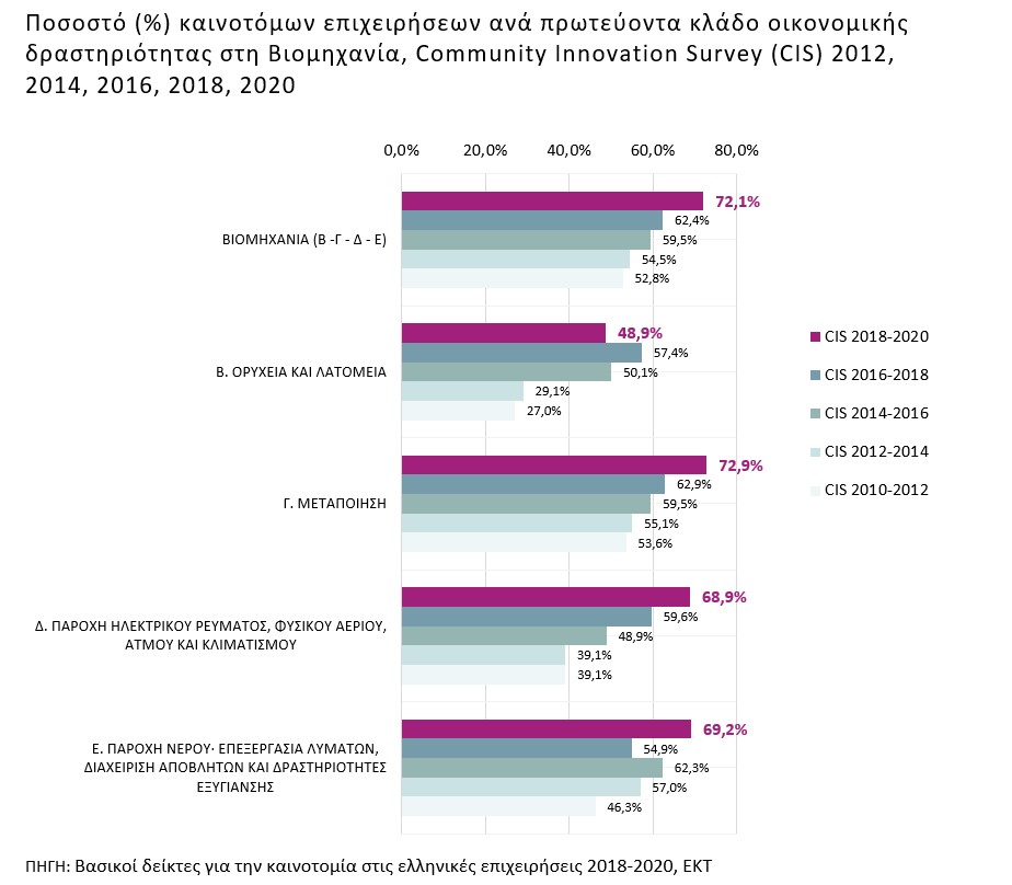Το ποσοστό καινοτομίας αυξάνεται και στον τομέα της Βιομηχανίας, όπου το ποσοστό καινοτόμων επιχειρήσεων την περίοδο 2018-2020 ανέρχεται σε 72,1%, σε σχέση με 62,4% την περίοδο 2016-2018, παρουσιάζοντας αύξηση κατά 9,7 ποσοστιαίες μονάδες. Το υψηλότερο ποσοστό καινοτόμων επιχειρήσεων (72,9%) καταγράφεται στον πολυπληθή κλάδο της Μεταποίησης.