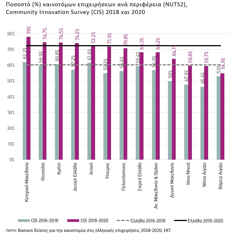 Τέλος, όσον αφορά την περιφερειακή κατανομή των καινοτόμων επιχειρήσεων, την περίοδο 2018-2020 ποσοστά καινοτόμων επιχειρήσεων υψηλότερα από τη μέση εθνική επίδοση (72,6%), καταγράφονται στην Περιφέρεια Κεντρικής Μακεδονίας (78,0%), στην Περιφέρεια Θεσσαλίας (74,7%), στην Περιφέρεια Κρήτης (74,5%) και στην Περιφέρεια Δυτικής Ελλάδας (74,2%). Σε όλες τις Περιφέρειες τα ποσοστά καινοτομίας είναι υψηλότερα από 50%.
