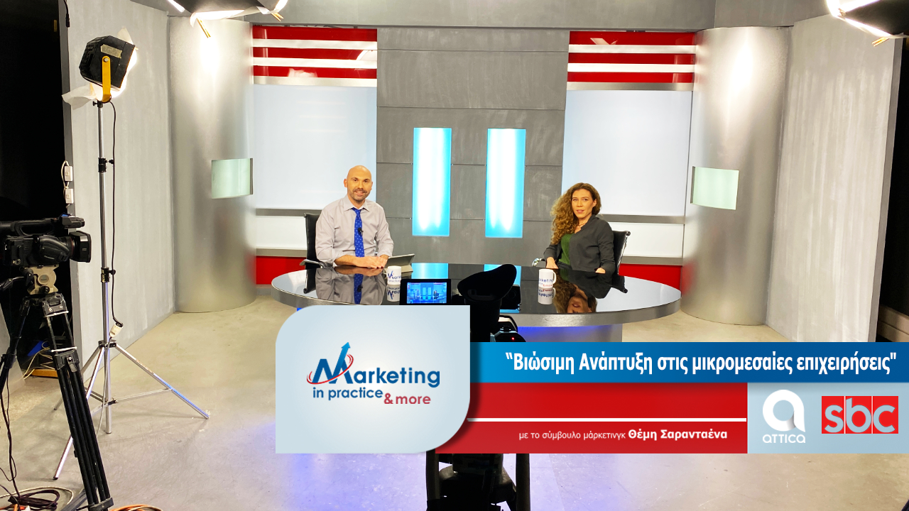 Στο νέο επεισόδιο της τηλεοπτικής εκπομπής Marketing in Practice o σύμβουλος μάρκετινγκ Θέμης Σαρανταένας με καλεσμένη στο studio του Attica TV/SBC TV Channel την Associate Partner – Υπηρεσίες Κλιματικής Αλλαγής και Βιώσιμης Ανάπτυξης της ΕY Ελλάδος Κιάρα Κόντη, συζητούν για την Βιώσιμη Ανάπτυξη στις μικρομεσαίες επιχειρήσεις σήμερα.
